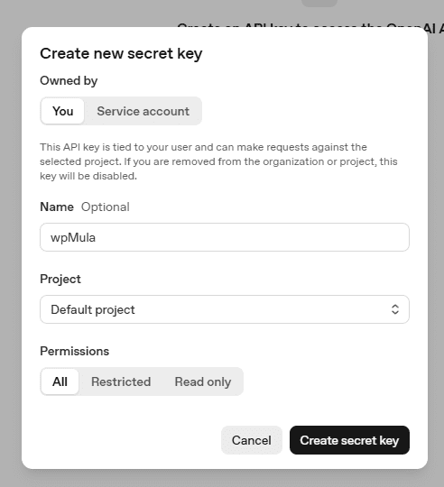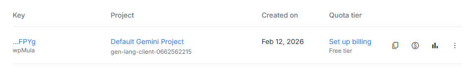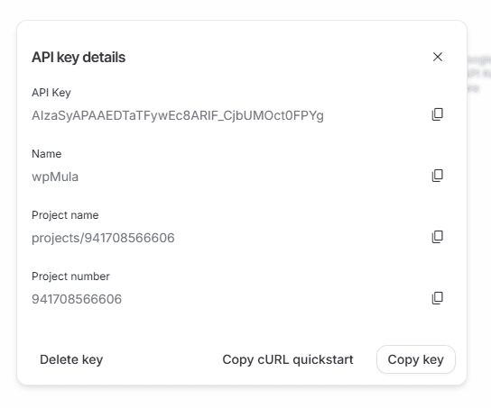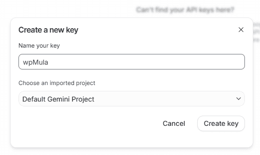Je kunt de standaard Gemini API-sleutel gebruiken als je één website vertaalt. Als je wpMula gebruikt voor meerdere websites/klanten, is het verstandig om aparte sleutels aan te maken voor elke klant/website. Op deze manier kun je eenvoudig het gebruik/de kosten per sleutel per klant/website bijhouden. Voor het aanmaken van een nieuwe sleutel klik je op ‘Create API key’.