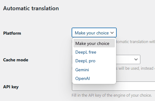 Eerst moet je het type vertaalmethode kiezen waarmee je wilt werken. Ga naar de algemene instellingen van wpMula en scroll naar deze sectie.