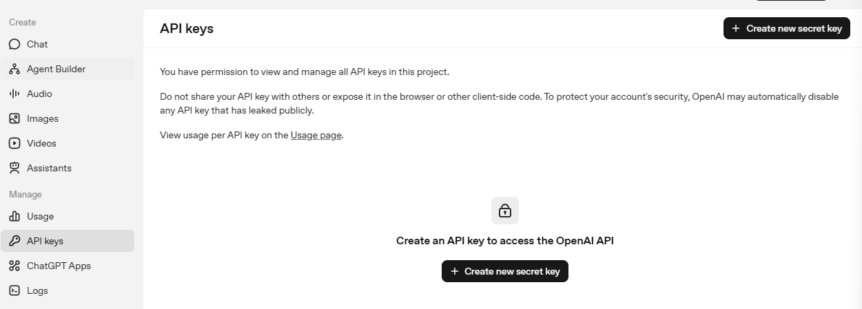 Klik op ‘Create new secret key’ om een nieuwe API-sleutel aan te maken.